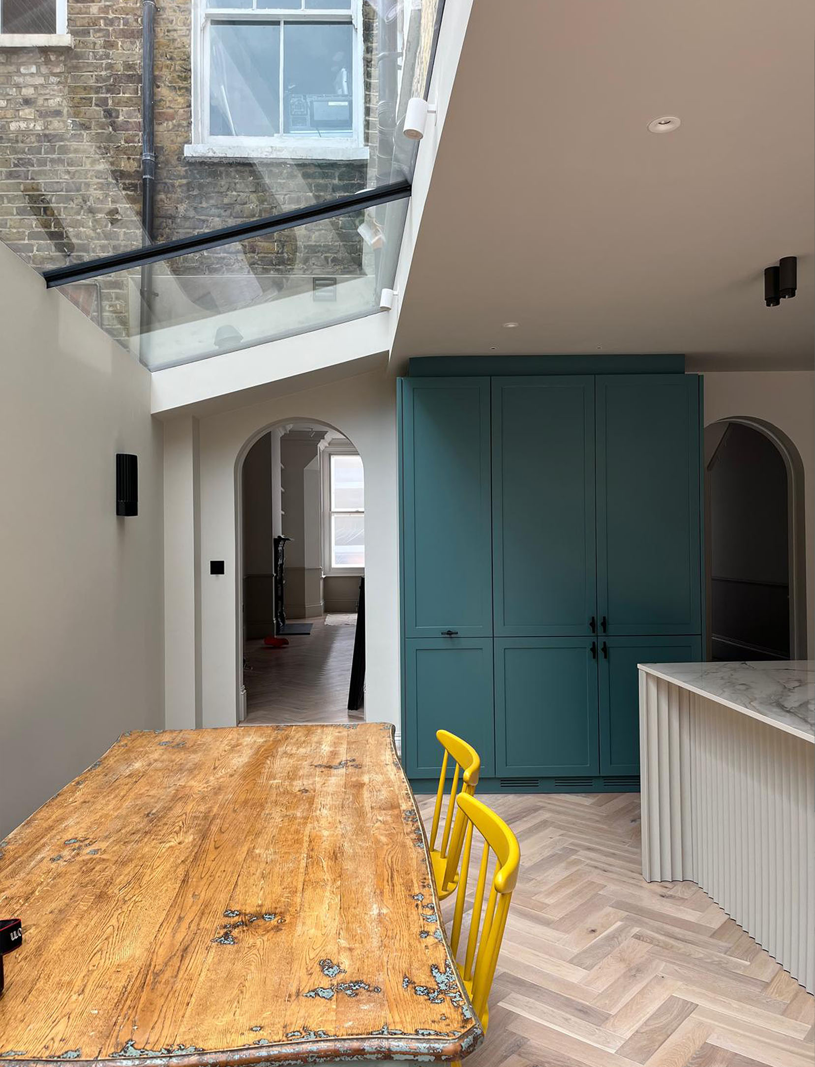 An arched doorway softens the architectural lines, adding a subtle sense of flow and transition. The result is a kitchen that feels both expressive and refined — a considered balance of symmetry, materiality and bold, design-led character.